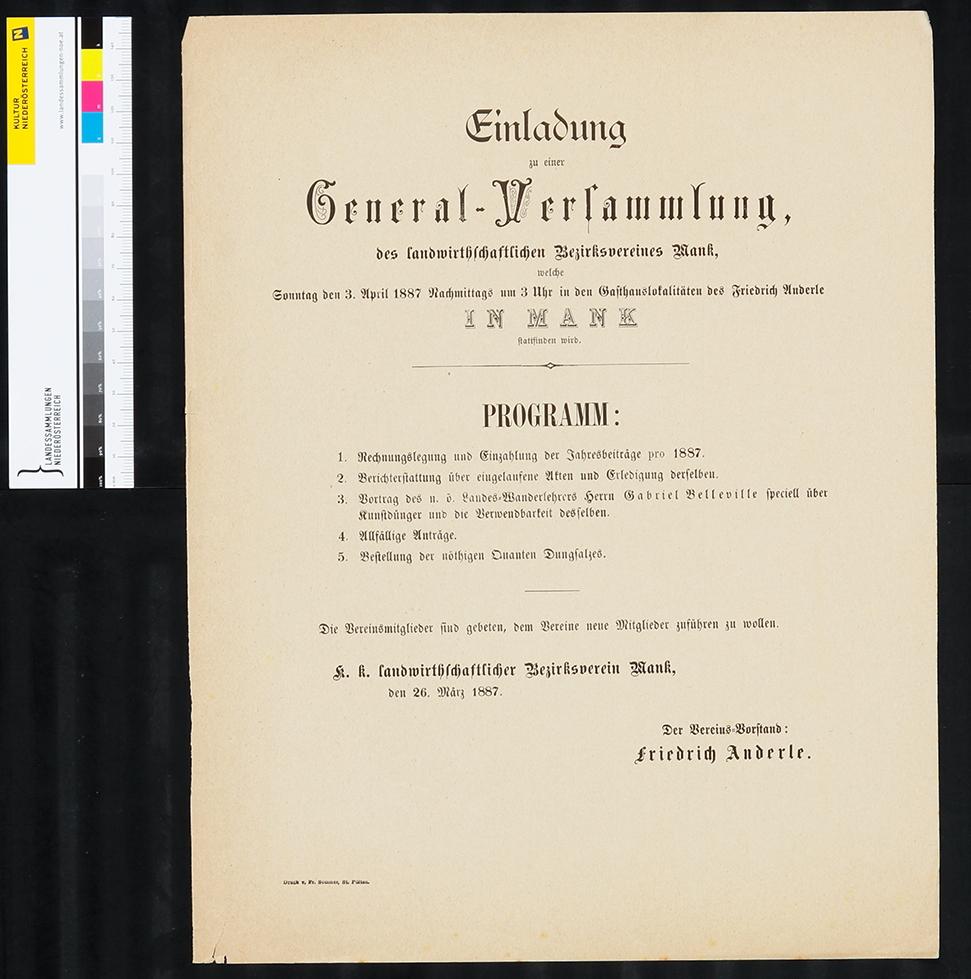 Einladung, Generalversammlung des landwirtschaftlichen Bezirksvereines Mank, Gasthaus Friedrich Anderle, 3. April 1887.