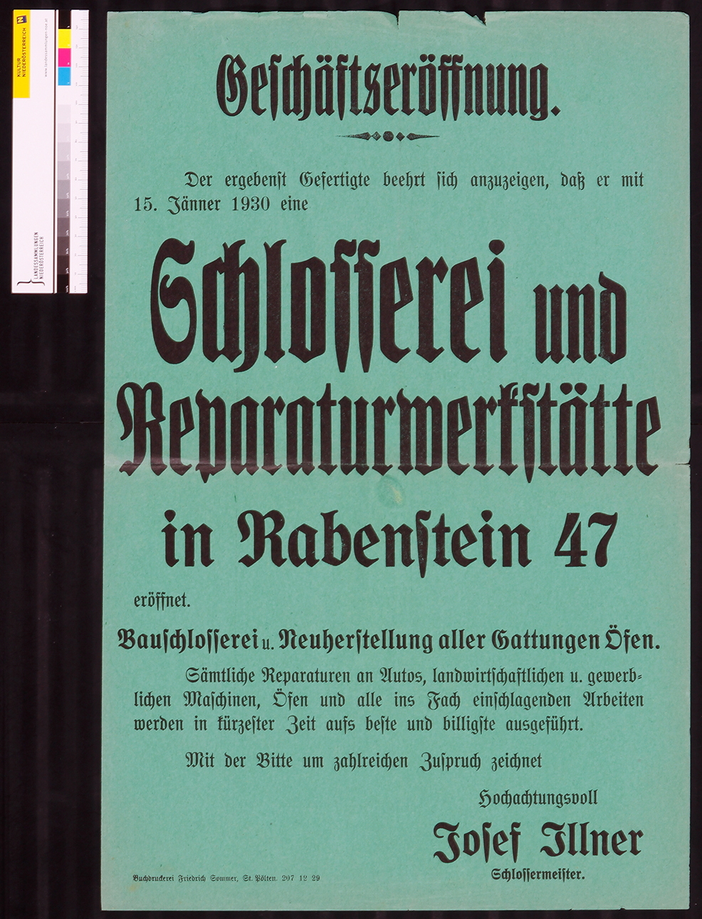 Geschäftseröffnung, Schlosserei und Reparaturwerkstätte in Rabenstein 47, Schlossermeister Josef Illner, 15. Jänner 1930.