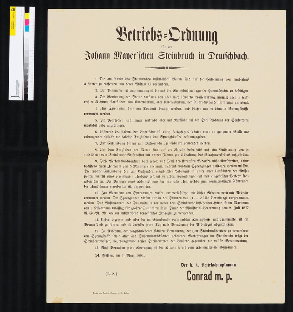 Betriebsordnung, Steinbruch Johann Mayer in Deutschbach, 3. März 1894.