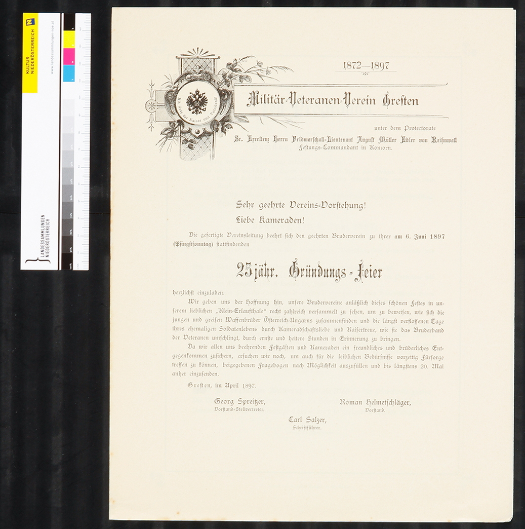 Einladung, 25-jährige Gründungsfeier Militärveteranenverein Gresten, 6. Juni 1897.