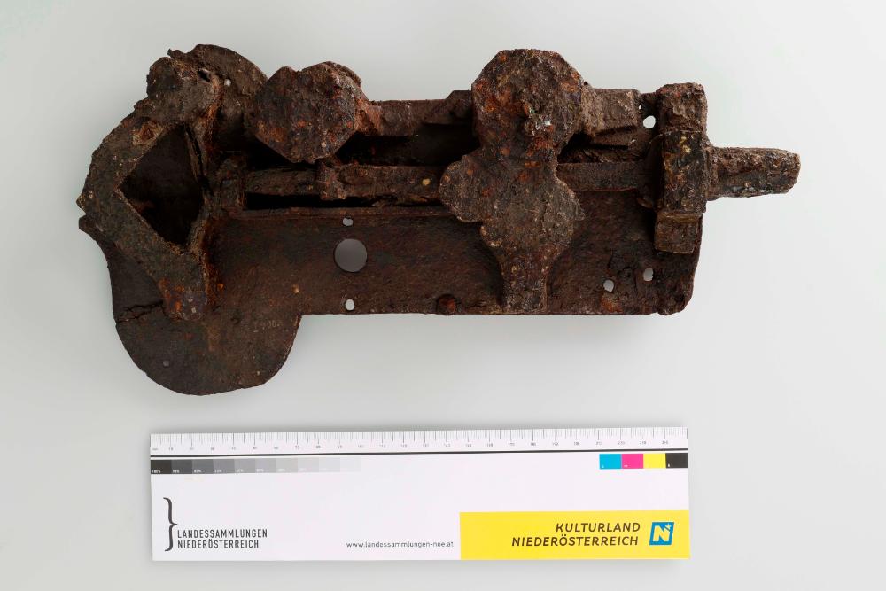 Das Türschloss aus Schmiedeeisen wurde genietet und gelötet. Das Schloss, das für den Einbau an der Innenseite einer Tür konzipiert ist, verfügt über ein Schlossblech, das sich durch ein geschweiftes, spitz auslaufendes Ende auszeichnet. Der Schließmechanismus besteht aus schießenden Fallen und Scheinfedern und wurde mit einem Schlüssel betätigt.