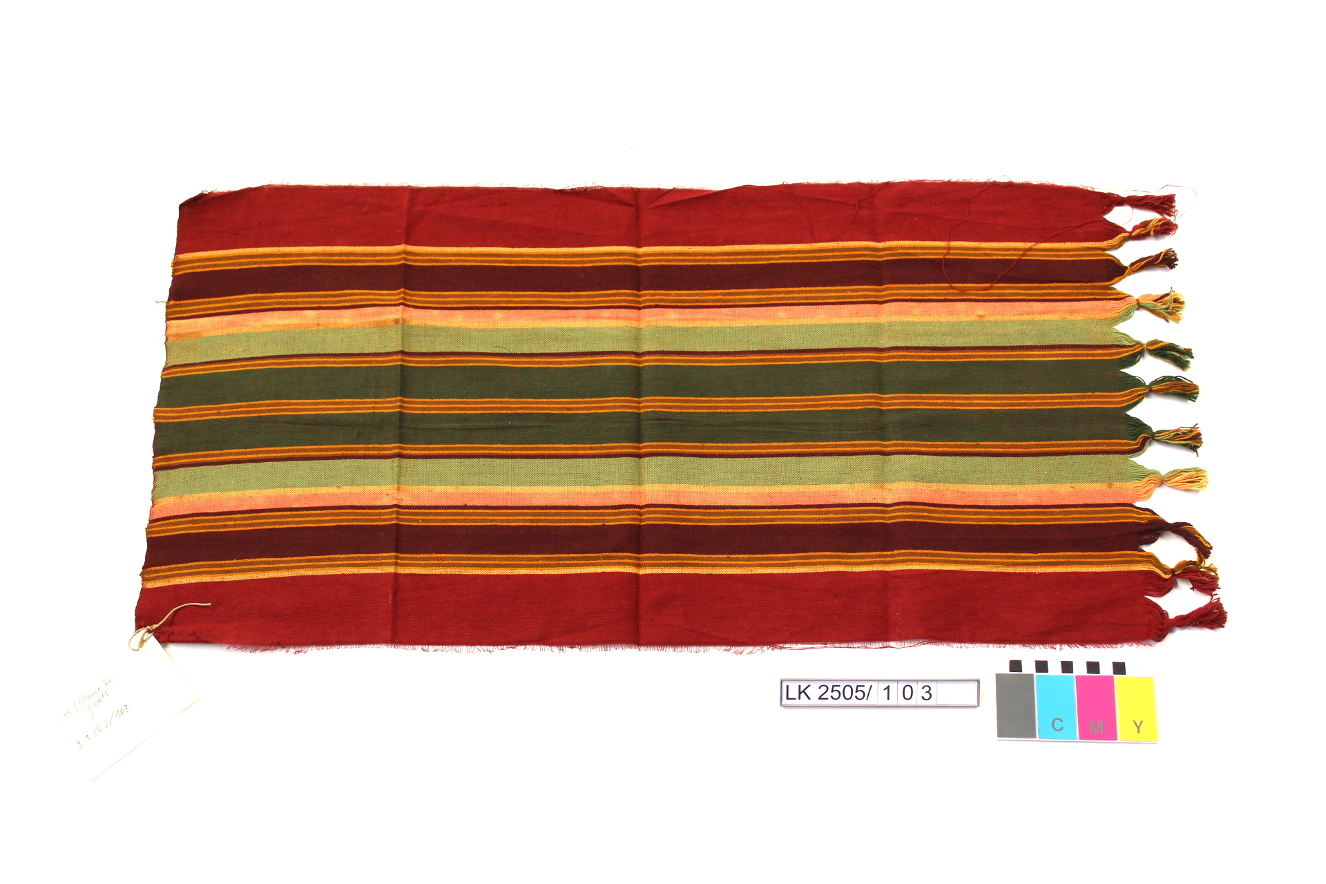 Stoffmuster quergestreift in rot, dunkelrot, grün, rosa, ocker, braun; Muster eines glatten Stoffes; Streifenornament; Fransen;