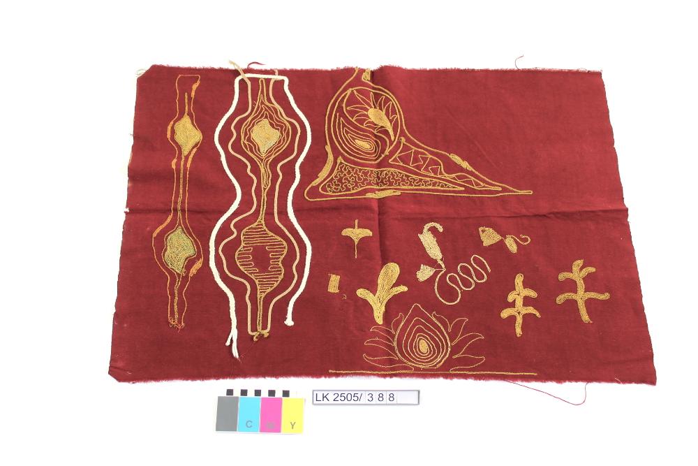 Stickproben auf rotem Gewebe mit Schnurstickerei in weiß, gelb, gold, grün, rot; Stickprobe für Stick- und Perlmaschinen; Chenillefaden