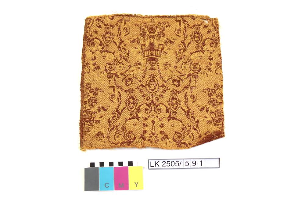 Stoffmuster in beige, mit floral, ornamentalenm Muster in braun, gelb; Muster für Dekorstoff; figural ornamentiert;