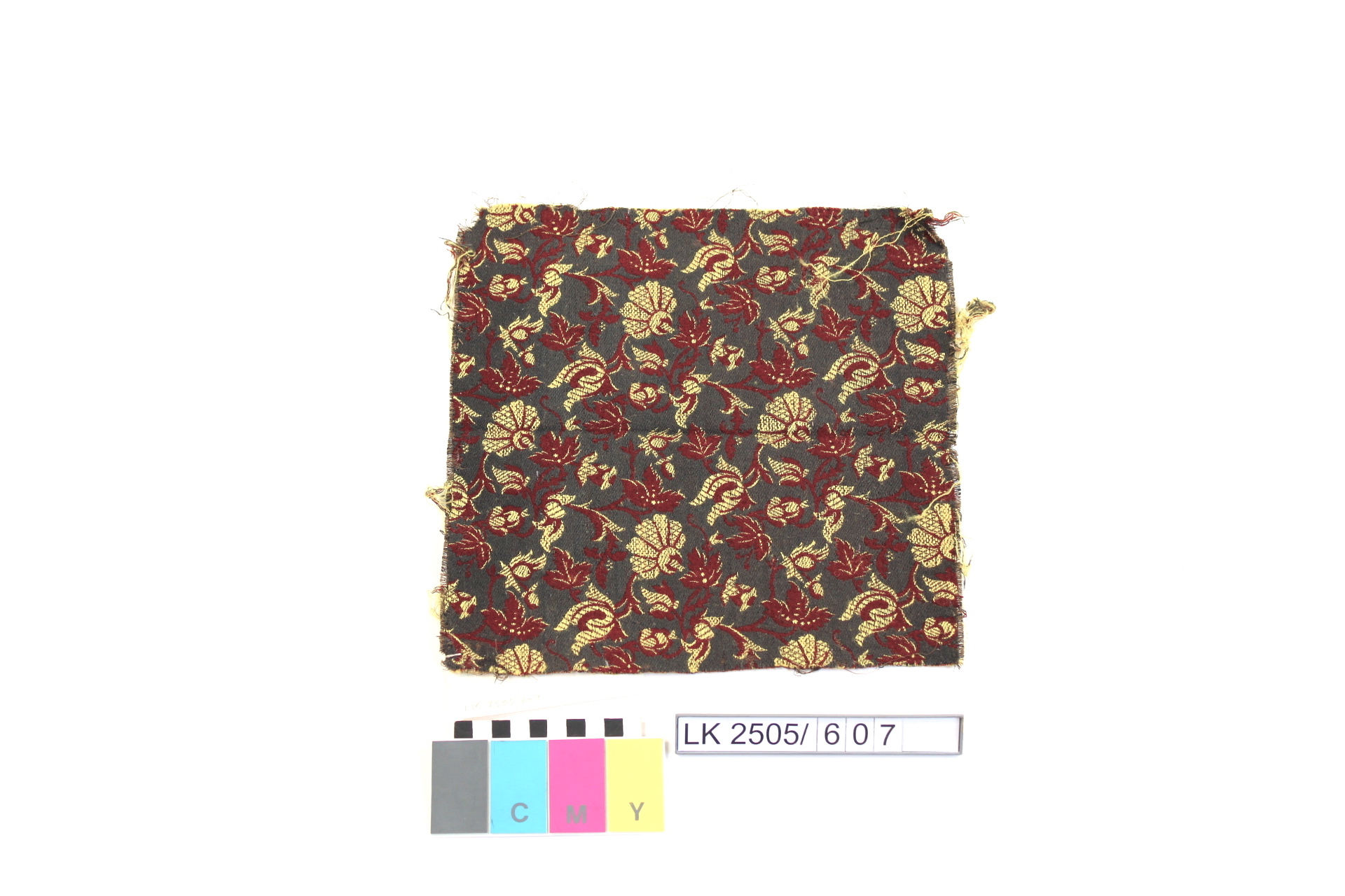 Stoffmuster in dunkelgrau, mit Blumen - und Blattmuster in rot, gelb; Muster für Dekorstoff; figural ornamentiert;