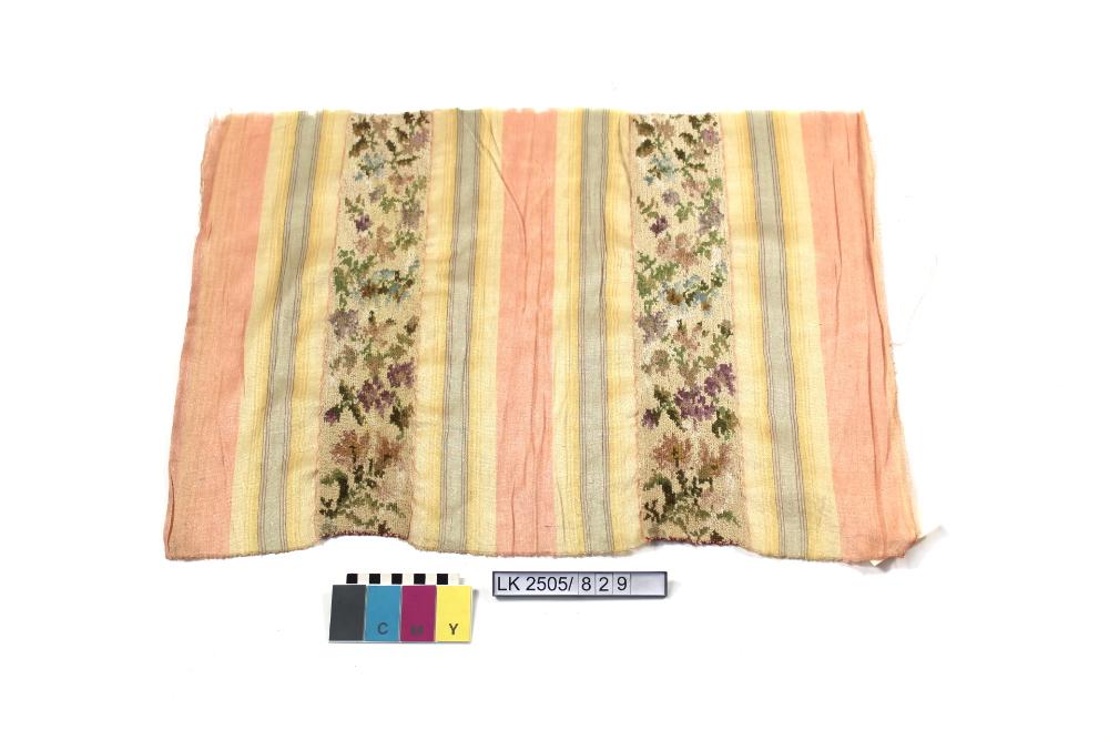 Stoffmuster, quergestreift mit Chenillebordüren mit Blumenranken, lila, rosa, blau, grün, weiss, beige, grau, gelb; Dekorstoffmuster mit Chenillegewebe;