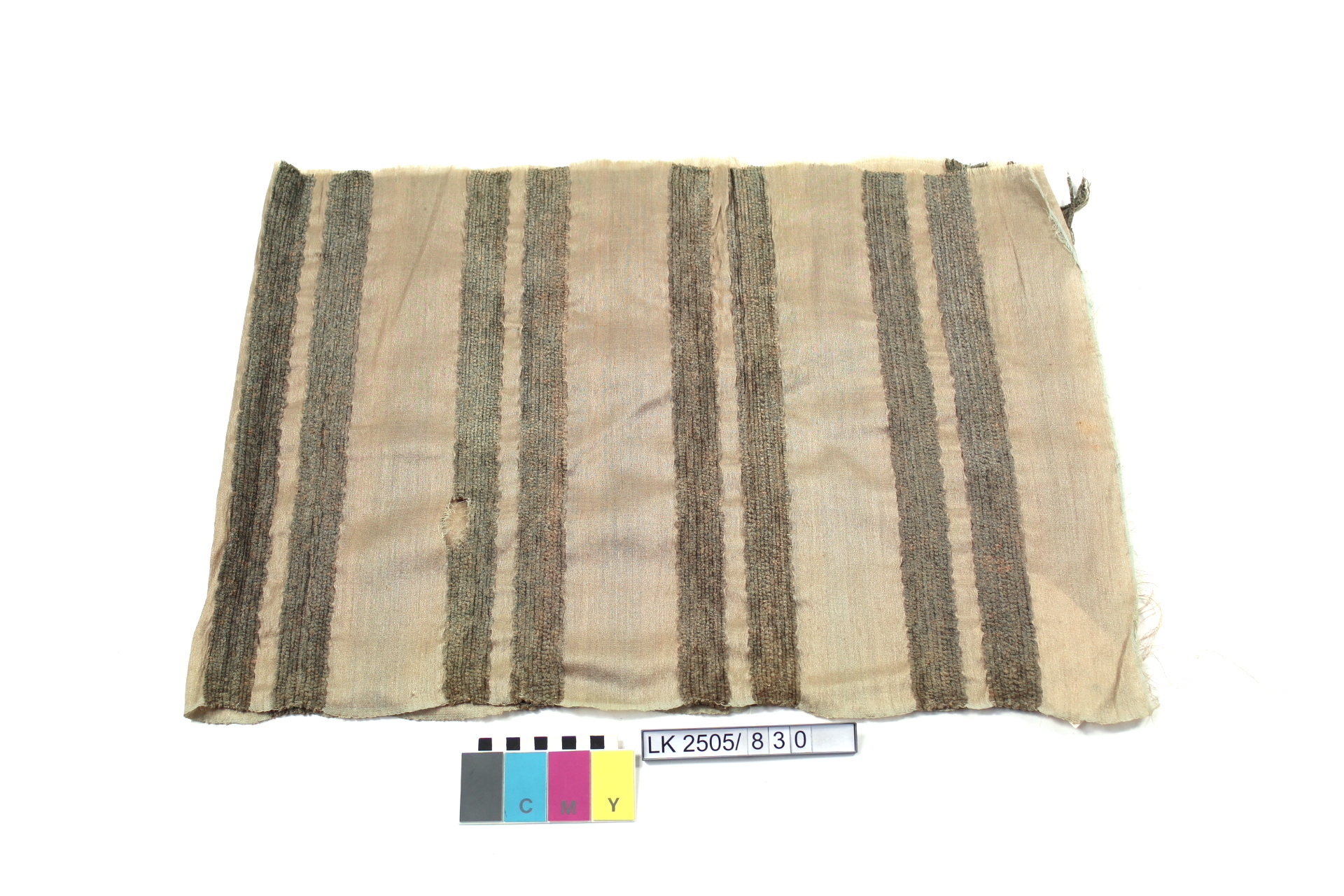 Stoffmuster in beige, quergestreift mit Chenille in blau; Dekorstoffmuster mit Chenillegewebe;