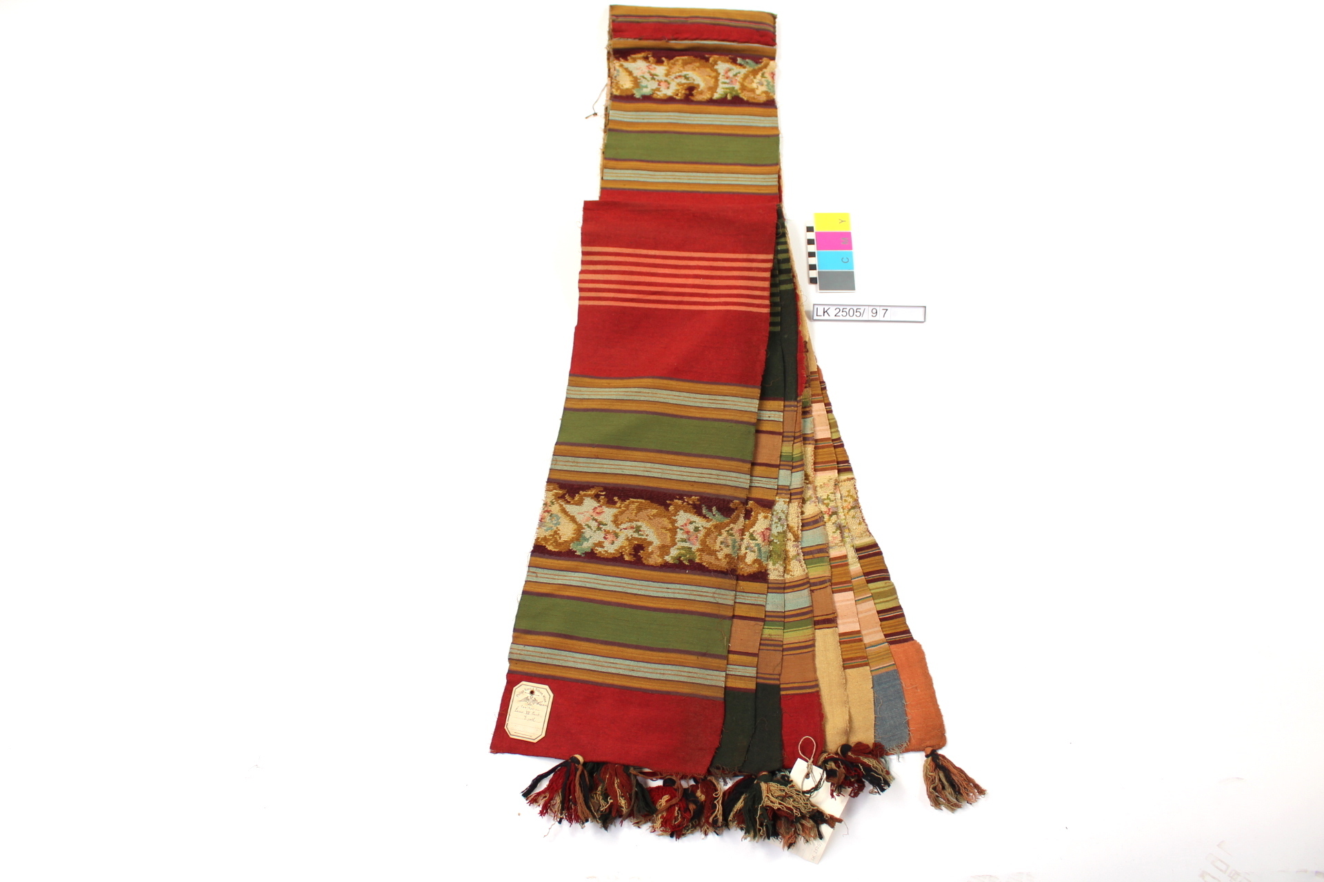 Musterbund mit 8 Streifen, quergestreift mit Blumenbordüren in Chenille in diversen Farben, mit Quasten; sogenannter Musterbund (zum Vorführen vor Kunden) mit Chenille; Streifenornamentik; Quasten; Fransen; 7 verschiedene Dessins für Portieren: Serie "Lou