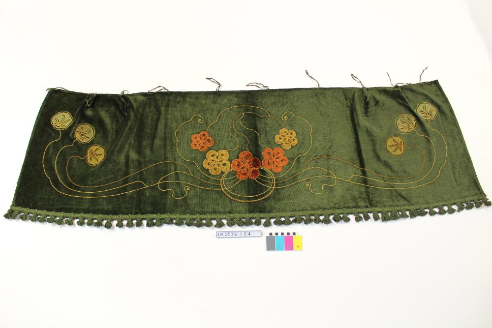 Portier in in grün mit Schnurstickerei in Grün-, Brauntönen, floraler Jugendstil, Quastenborte; Portiere; mit Chenillefaden bestickt; Borte mit Quasten (z. T. leonischer Faden); Ringe zum Aufhängen; floraler Jugendstil; Teil einer Garnitur;