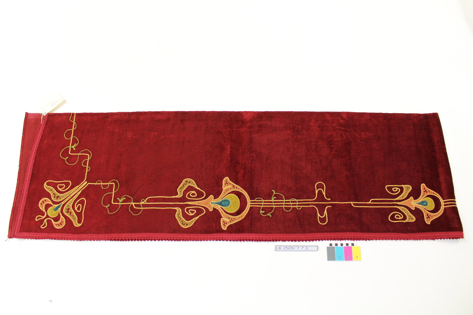 Seitenteil in rot mit Schnurstickerei in grün, blau, gelb, gold, braun; Vorhangseitenteil; teils mit Chenillefaden, teils leonisch bestickt; Borte; floraler Jugendstil; Teil einer Garnitur; vgl. Obj. 9.1./C4/174