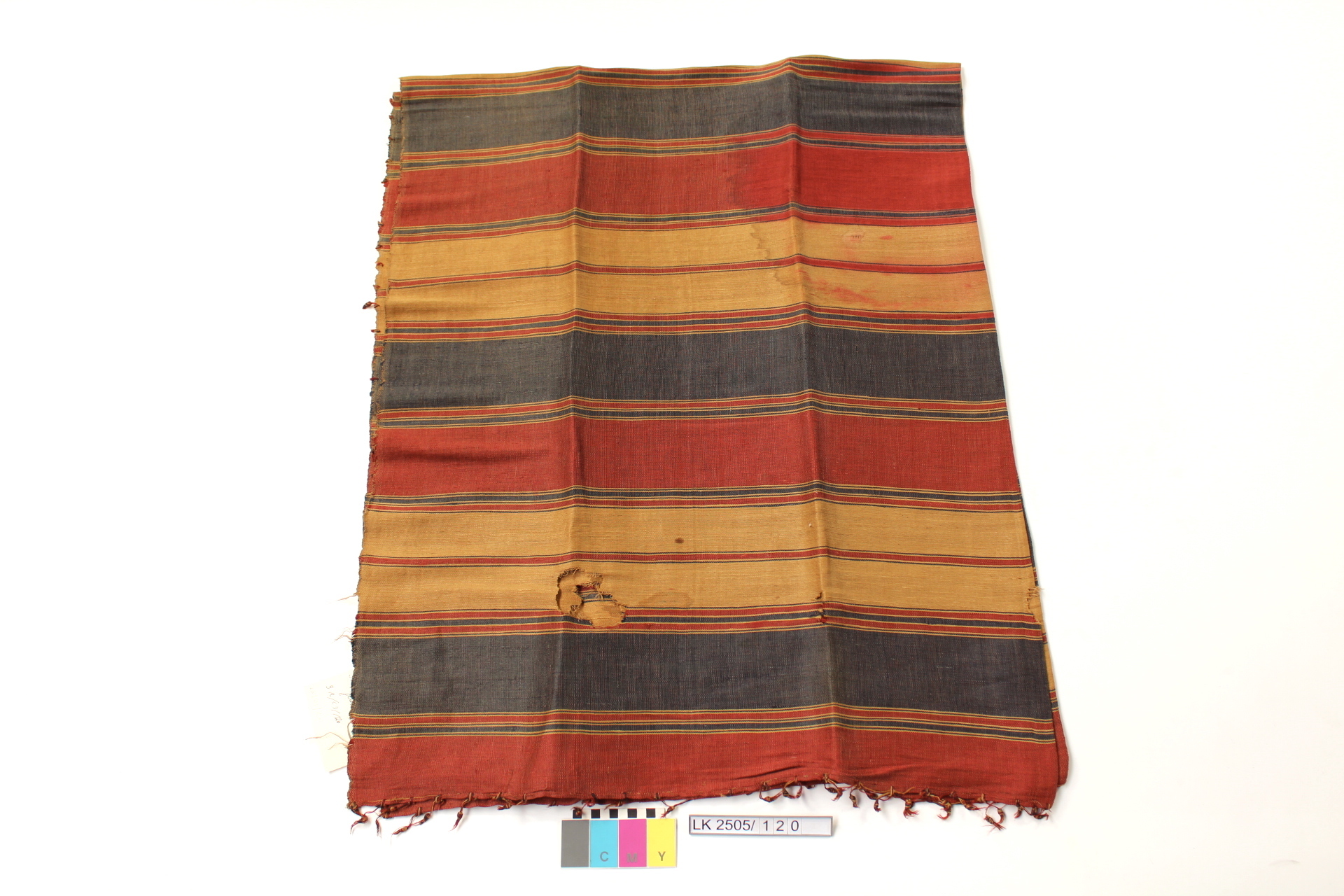 Stoffmuster quergestreift in rot, blau, ocker; Muster eines glatten Stoffes; Streifenornament; afrikanisierendes Dessin;