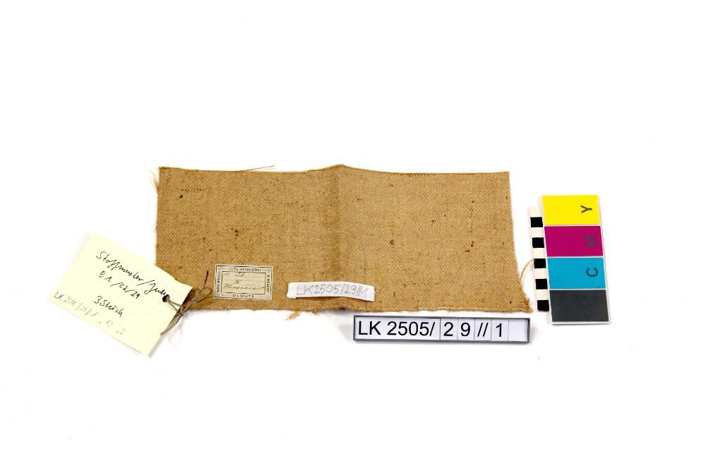 Naturfarbenes Jutegewebe; Konvolut aus Jutestoffmustern; die Stücke sind bezeichnet und stammen aus der Jutespinnerei "Josef Etrich Söhne" in Trautenau sowie aus der Jutespinnerei "Würbenthaler" in Olmütz