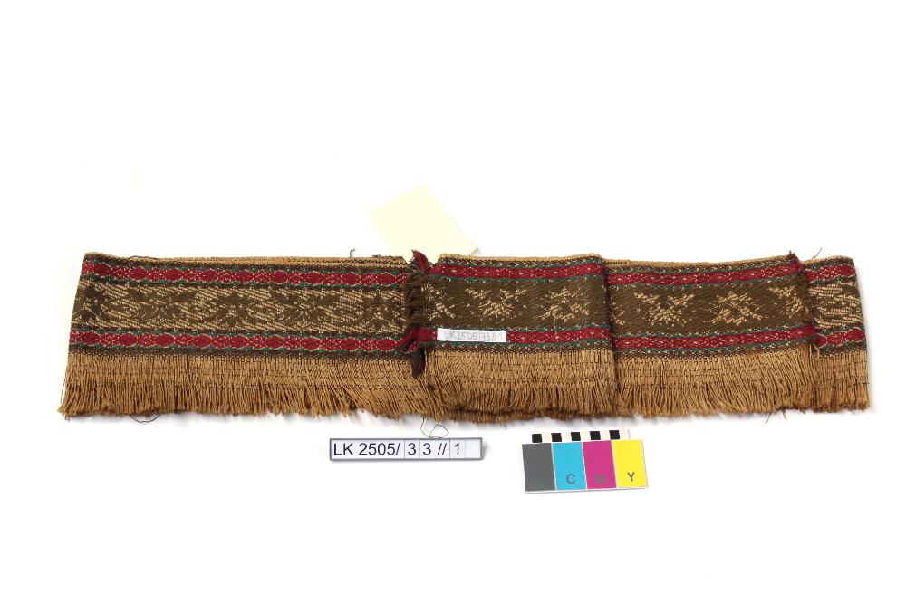 Borte mit Rankenmuster in olivgrün, rot, petrol, Jutefransen; breite mehrgliedrige Bordüre mit langer Fransenzone;