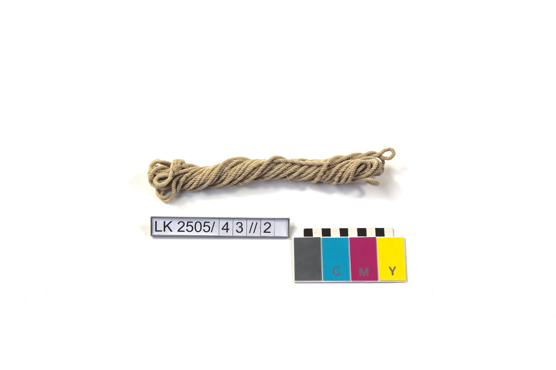 Kordelstrang gedreht, weiß (vergraut); Konvolut aus fünf Schnüren unterschiedlicher Farbe und Stärke; sie dürften als Ausgangsstoff für die Erzeugung von Kordeln oder Bordüren gedient haben;