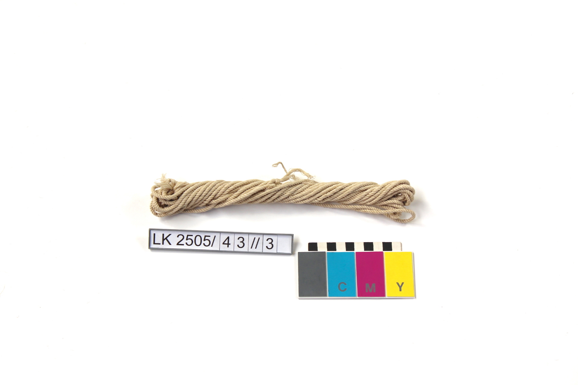 Kordelstrang gedreht, weiß; Konvolut aus fünf Schnüren unterschiedlicher Farbe und Stärke; sie dürften als Ausgangsstoff für die Erzeugung von Kordeln oder Bordüren gedient haben;