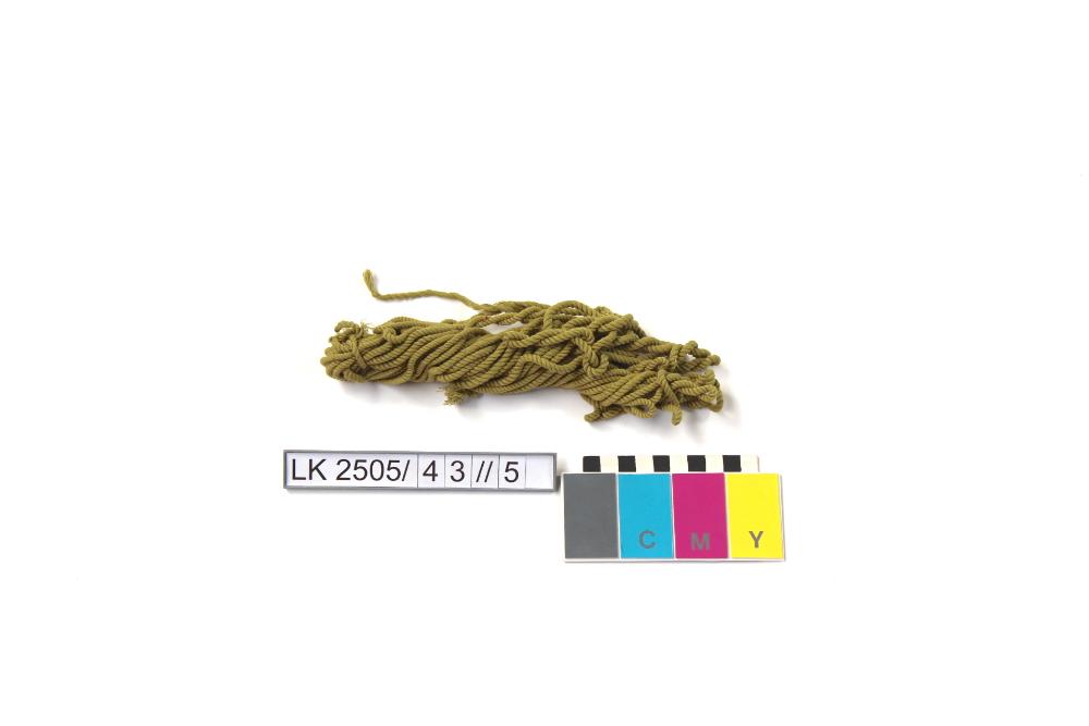 Kordelstrang gedreht, grün; Konvolut aus fünf Schnüren unterschiedlicher Farbe und Stärke; sie dürften als Ausgangsstoff für die Erzeugung von Kordeln oder Bordüren gedient haben;