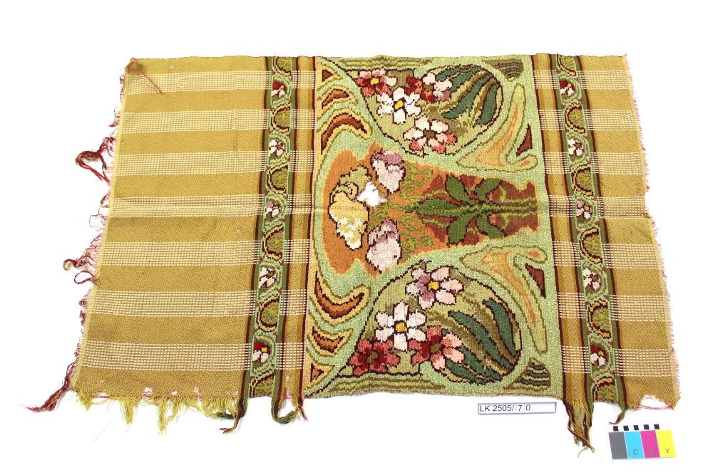 Seitenteil in beige/grün mit hellen Längsstreifen, Querstreifen in Chenille mit stilisiertem Pflanzenmuster in rosa, lila, grün, braun, rot. Fransen; Vorhangseitenteil (Muster) mit Chenillegewebe und Fransen; Jugendstil;