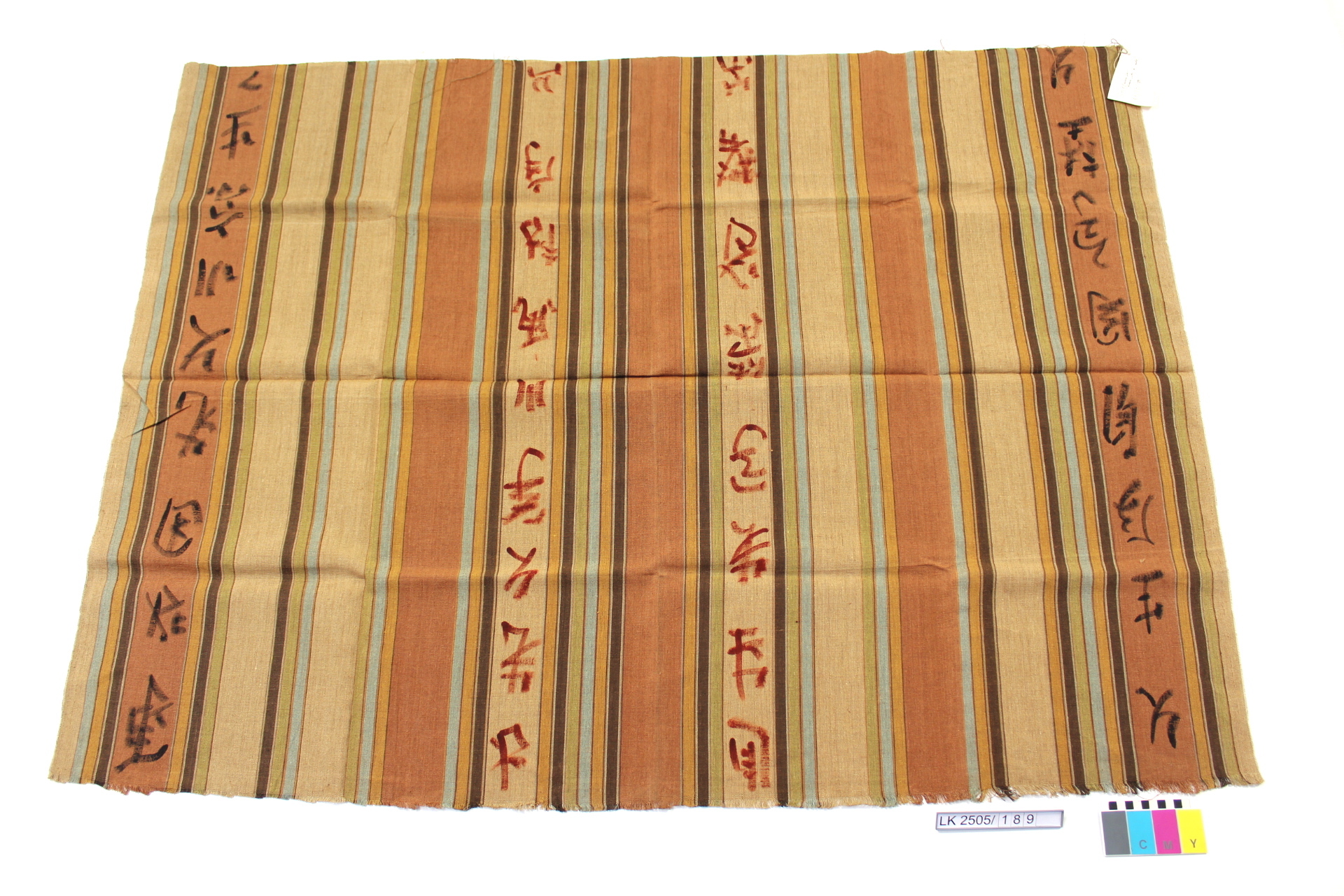 Stoffmuster mit längsstreifen in orange, blau, beige, braun, chinesische Schriftzeichen in schwarz und rot; Stoffmuster mit Anhänger "Dessin Nr. 6 alt"