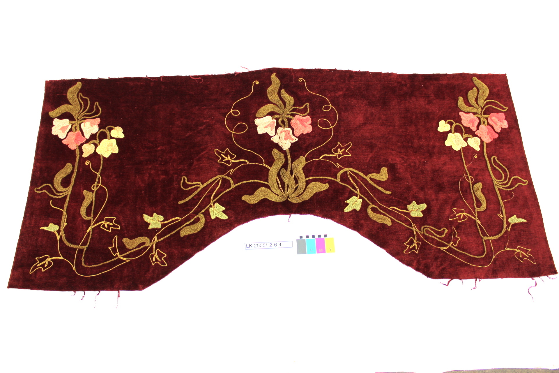 Portiere in rot, mit Schnur-, Chenillestickerei in grün, rosa, gelb. Floraler Jugendstil. 5 Montageringe; Portiere; mit Stick- und Perlmaschine bestickt; floraler Jugendstil