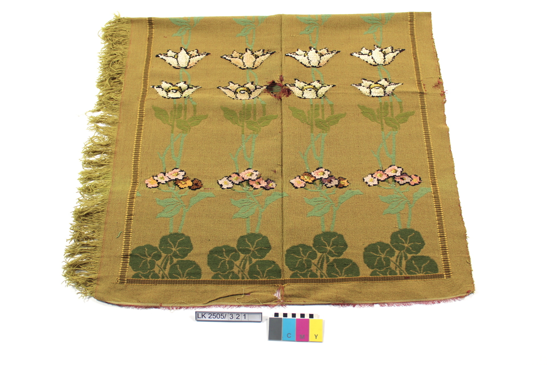 Vorhangseitenteil in beige, mit Jugendstilornamenten, Wasserpflanzen (Seerosen) in rosa, weiss, lila, braun, gelb, schwarz, grün; Vorhangseitenteil mit Chenillegewebe; früher floraler Jugendstil