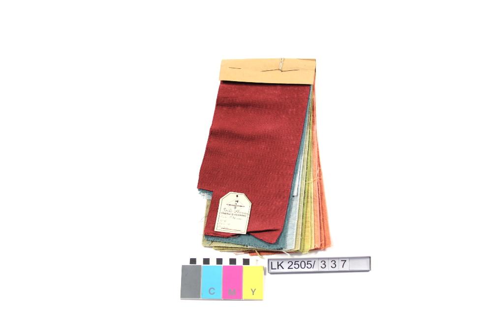 Musterbund in rot, 3x blau, beige, 3x grün, 3x orange; Musterheft mit 10 verschiedenen Farbstellungen; Dessin ""Toile Ottoman"; Musterschutz Hackl und Söhne (laut Anhänger)
