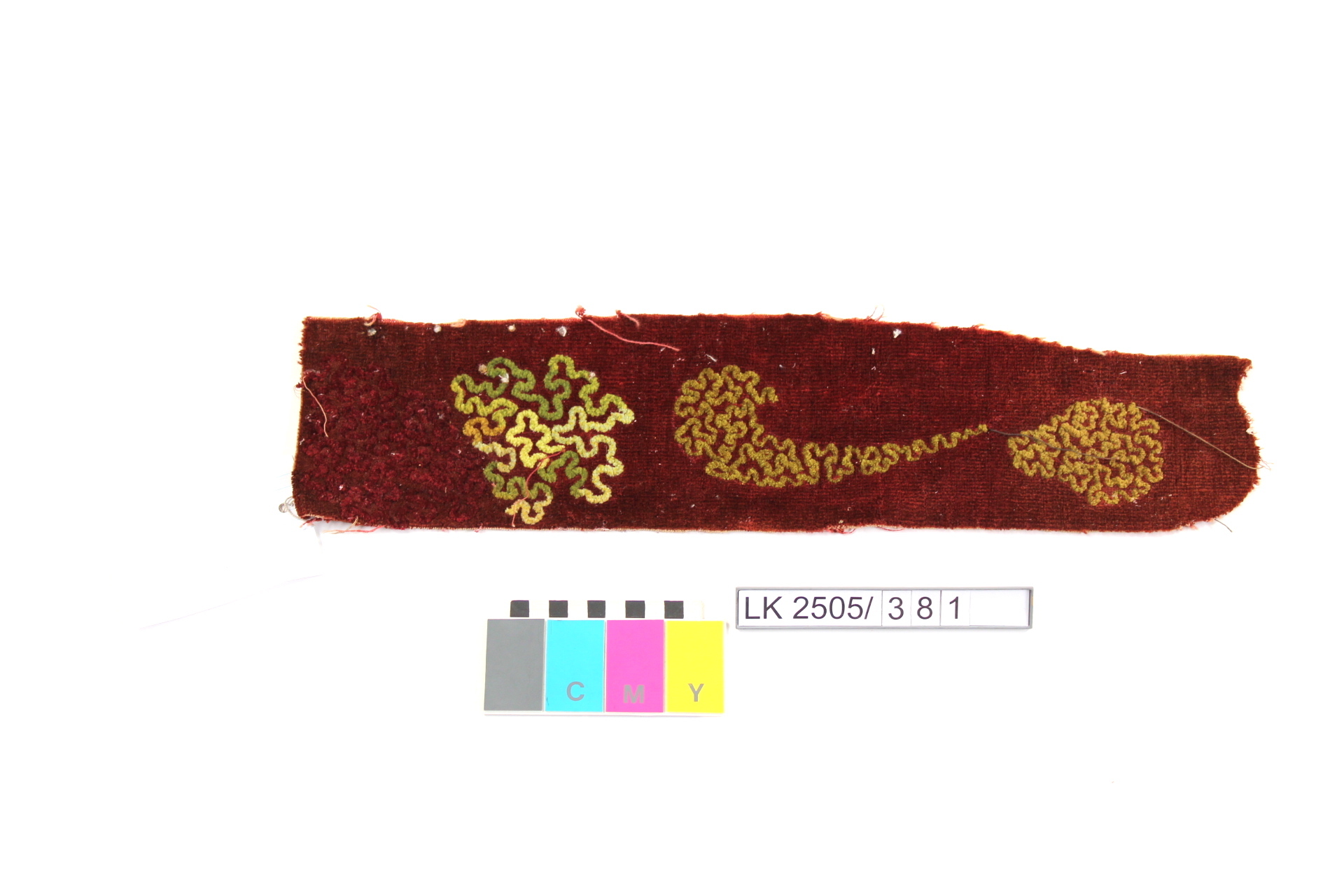 Stickprobe in rotem Samt mit Chenillestickerei in grün; Stickprobe für Stick- und Perlmaschinen; Chenillefaden