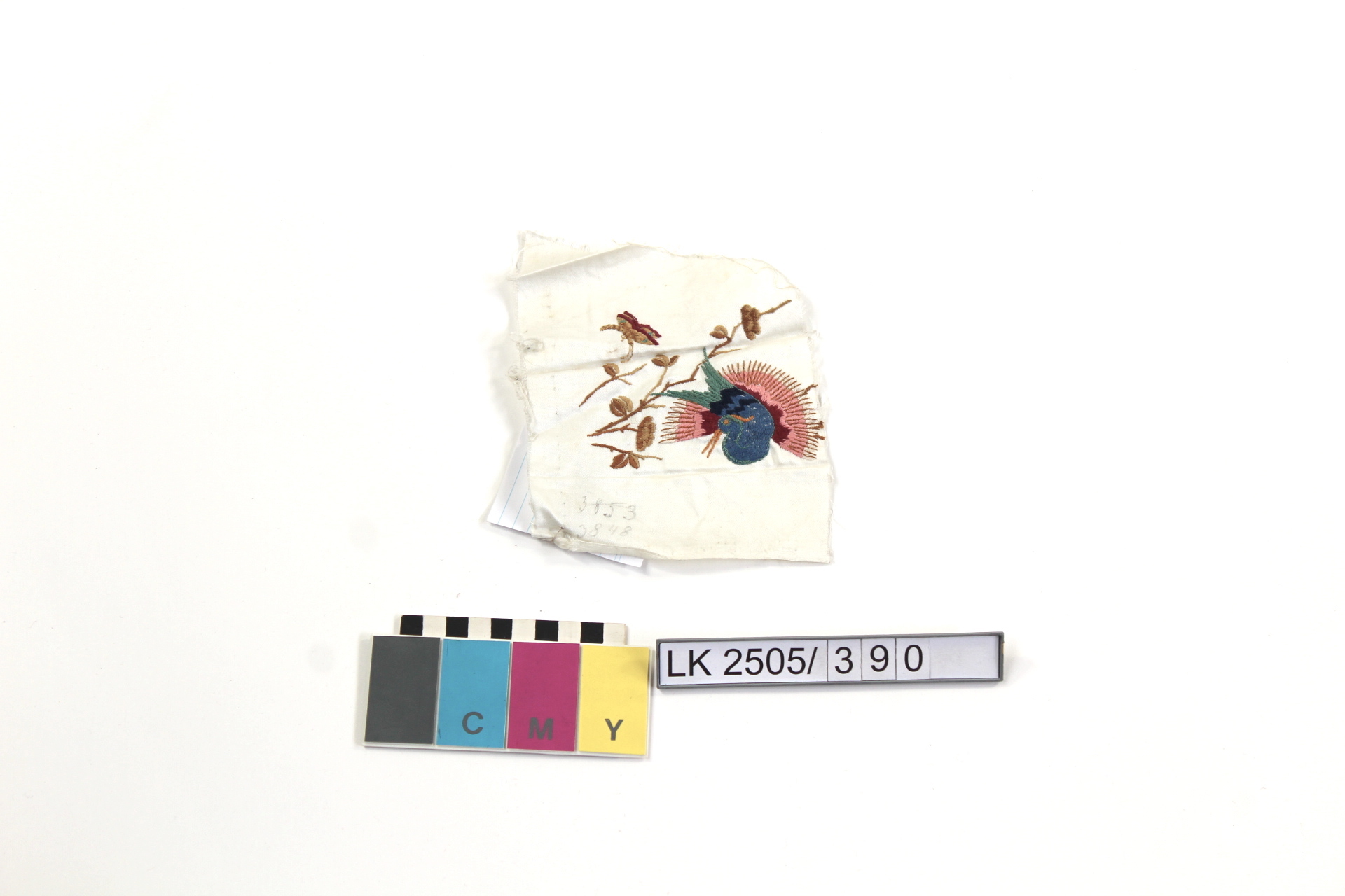 Stickprobe auf weißem Gewebe, bunt, Pfau, Schmetterling, Äste; Stickprobe für Garnstickerei