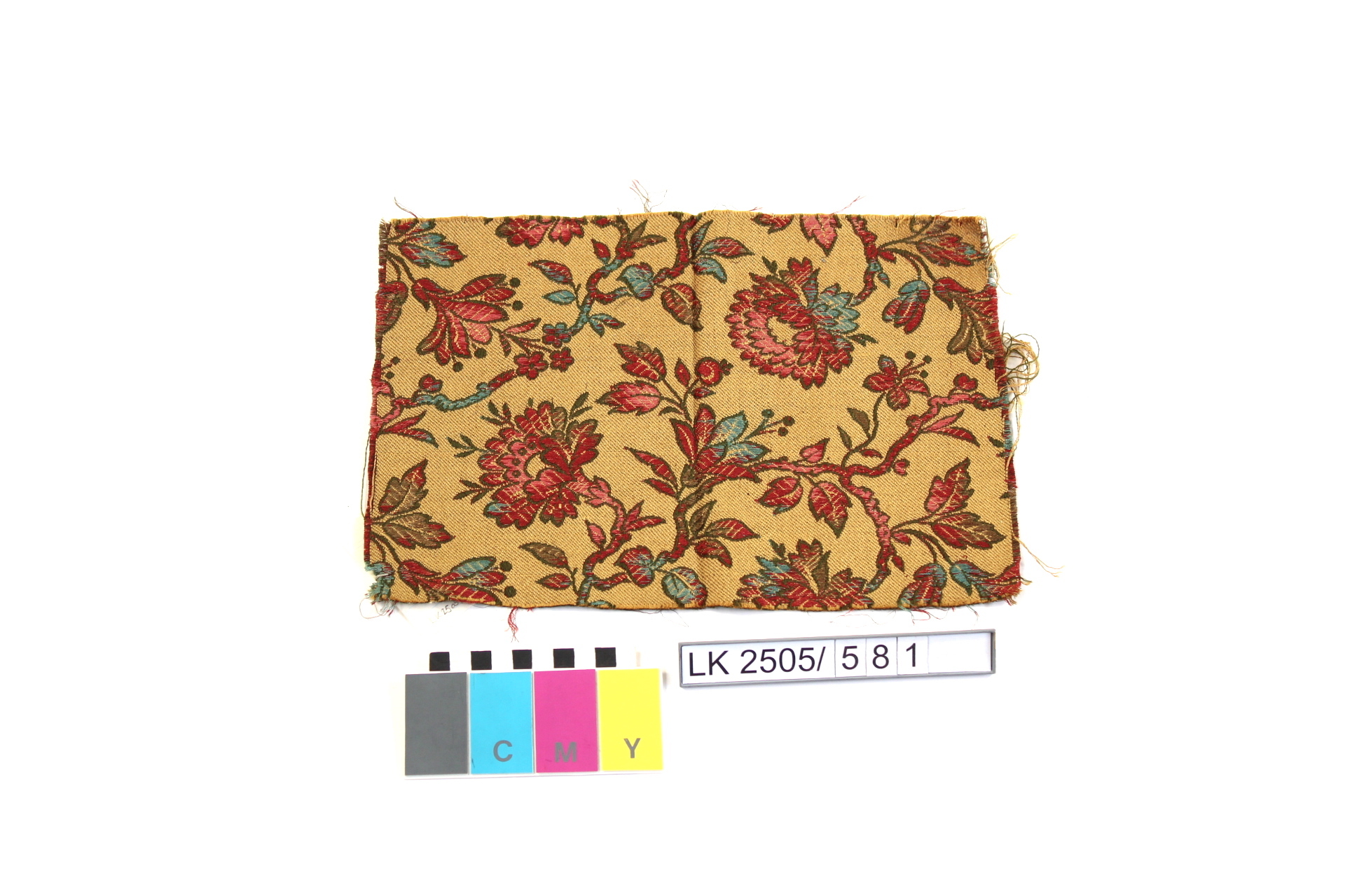 Stoffmuster in beige, mit Blumen- und Blattmuster in grün, rot, rosa, blau; Muster für Dekorstoff; figural ornamentiert;