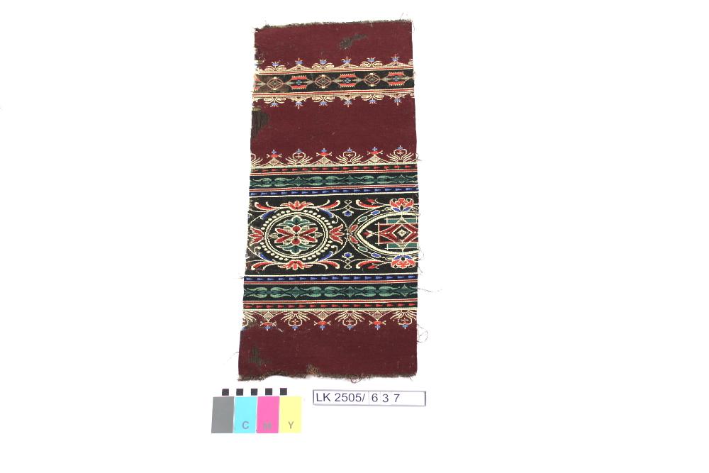 Stoffmuster in dunkelrot, mit Bordüren mit geometrischen Ornamenten in schwarz, rot, grün, blau, gelb; Dekorstoffmuster in Jacquardwebtechnik