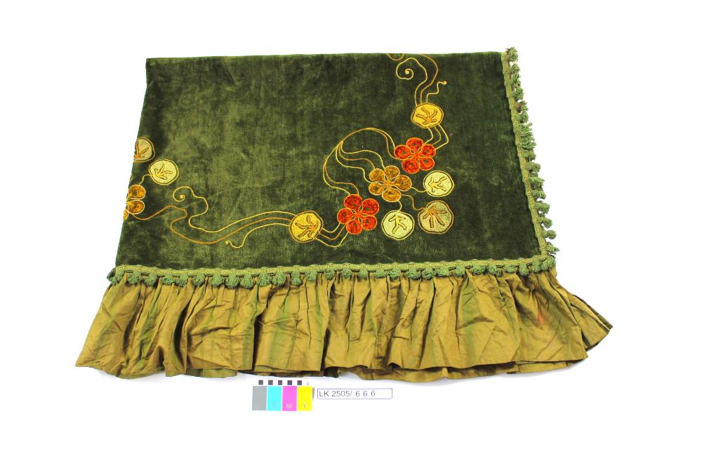 Bettüberwurf aus Samt in grün, mit Chenille-, Schnurstickerei in orange, braun, grün, beige, mit Quastenborte und Rüschenbesatz in grün; Bettüberwurf; mit Chenille und leonischem Fadem auf Stick-und Perlmaschinen bestickt