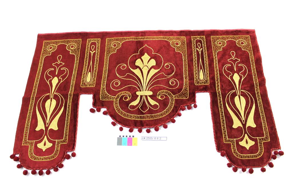 Roter Wandbehang mit ornamentaler Schnurstickerei in gold, gelb, beige, grün. Klettband. Bommel-, Kederabschluss; Portiere; mit Chenille auf Stick- und Perlmaschine bestickt; zum Teil leonischer Faden; floraler Jugendstil