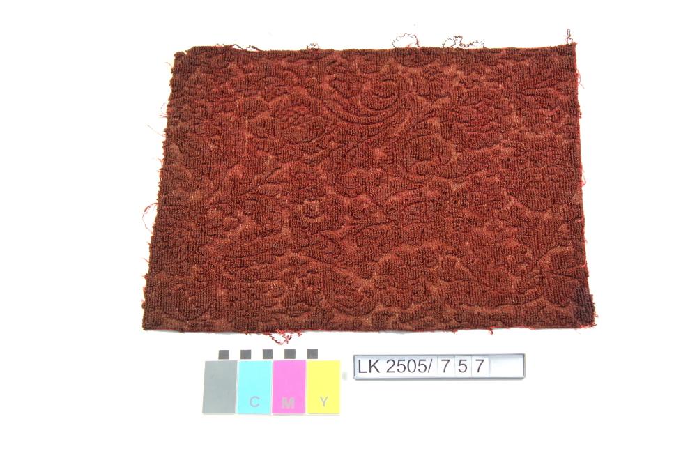 Presssamtgewebe in rot (nicht aufgeschnitten), mit Blumen- und Blättermuster; Jutepeluche; gepresst