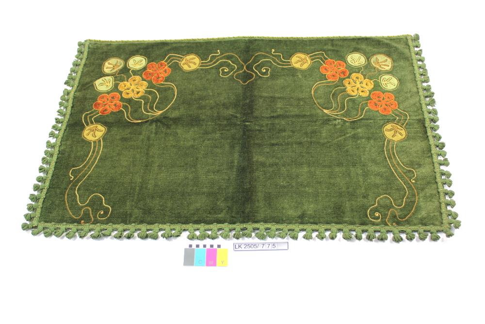 Behang in grün mit Schnurstickerei in Grün-, Brauntönen, floraler Jugendstil, Quastenborte. 3 Montageringe; Wandbehang; mit Chenille und leonischem Faden bestickt; Quasten; floraler Jugendstil