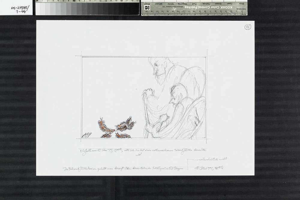 SignaturRecto, monogr. unten links: "AW"; Recto, bez. unten links: "In Tausendfüßlerkreisen spricht man besorgt über bevorstehende Schuhpreiserhöhungen …. wahrscheinlich nicht", dat. unten rechts: "15. Juni 77, 23.47 h"; Recto, oben rechts: "86" [in einem Kreis e