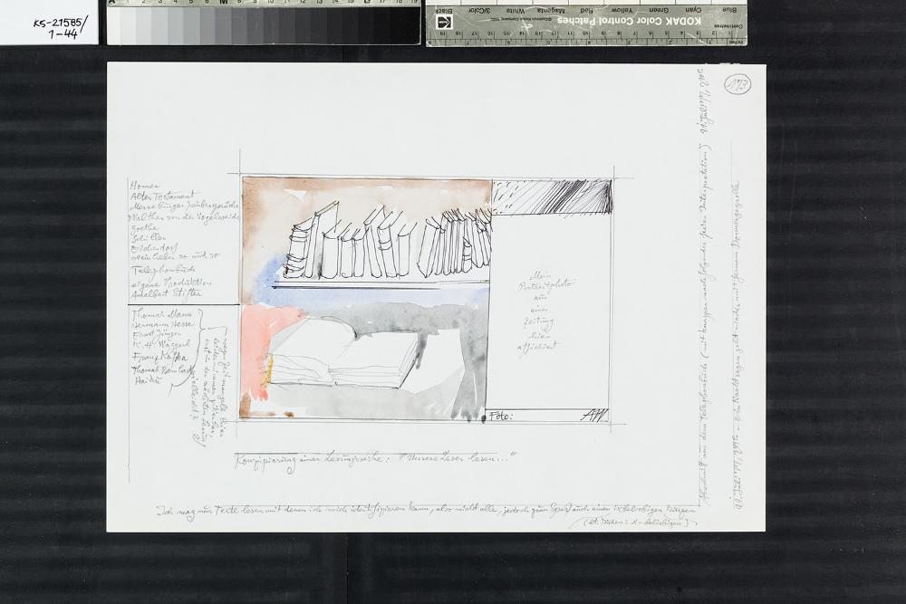SignaturRecto, monogr. unten rechts: "Foto: AW"; Recto, bez. unten mittig: "Konzipierung einer Lesungsreihe: "Unsere Leser lesen …""; Recto, unten: "Ich mag nur Texte lesen mit denen ich mich identifizieren kann, also nicht alle, jedoch zum Spaß auch einen ixb