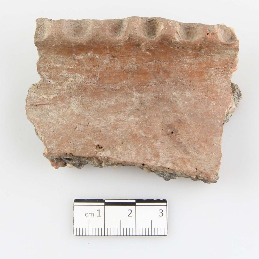 Randscherbe, ausladender Rand mit Eindruckverzierung am Mundsaum