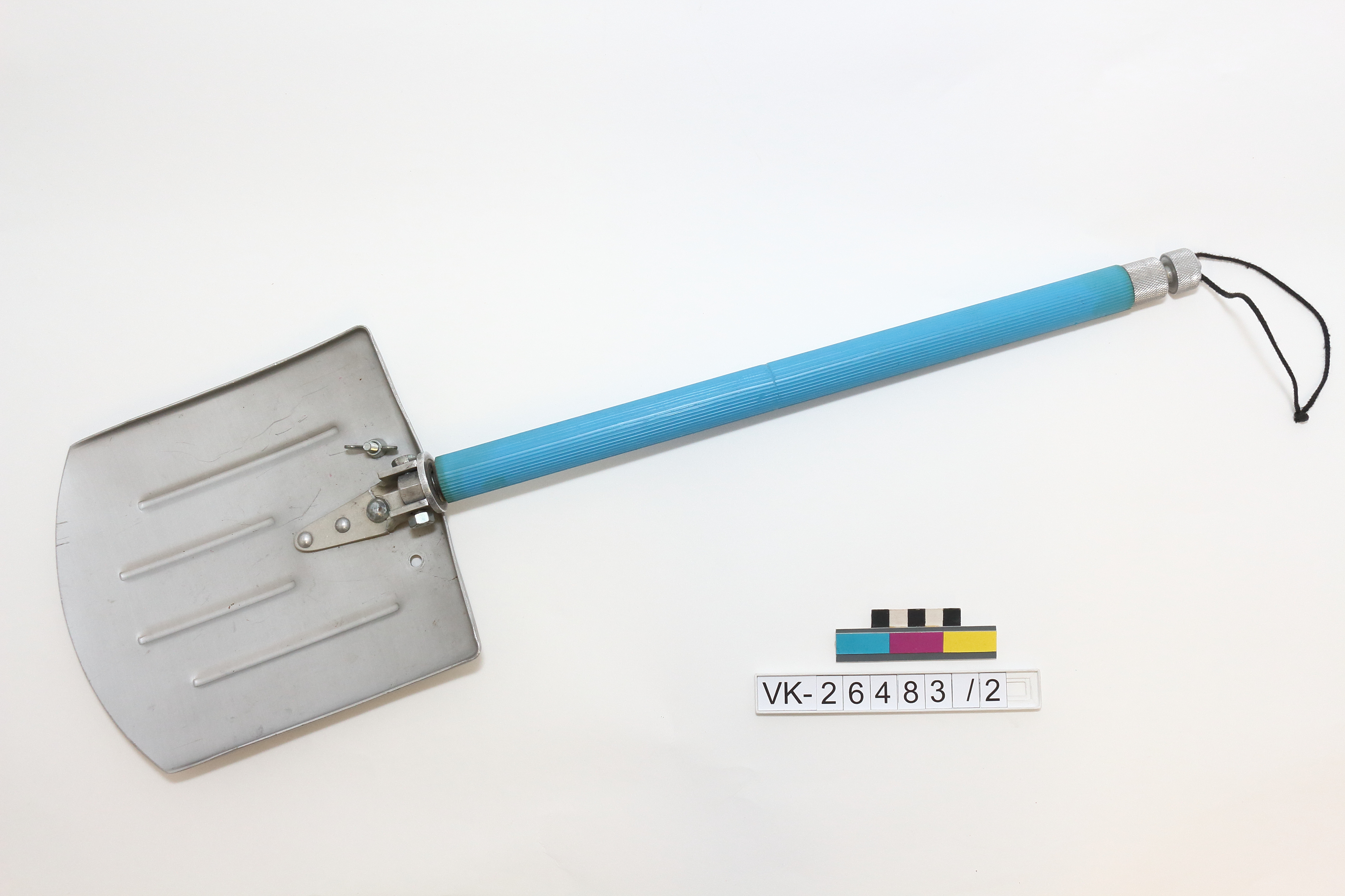 Teil einer AlpinistInnenausrüstung, überbracht von einem Mitglied des ÖAV St. Pölten: Schaufel (Lawinenschaufel) mit klappbarem Blatt und eingebauter Federwaage (Schneewaage). Das Blatt ist in drei Positionen zu arretieren.