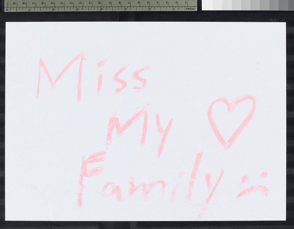 Handschriftlich mit Kreide, Papier mit Botschaft „Miss My Family?“ darunter trauriges Emoticon