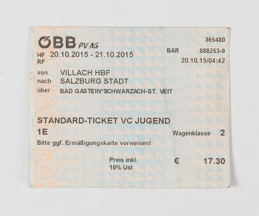 Ein Zugticket 2. Klasse für 1 Person zum Jugendtarif für die Strecke Villach HBF nach Salzburg Stadt. Bar gekauft am 20.10.2015, um 4:42