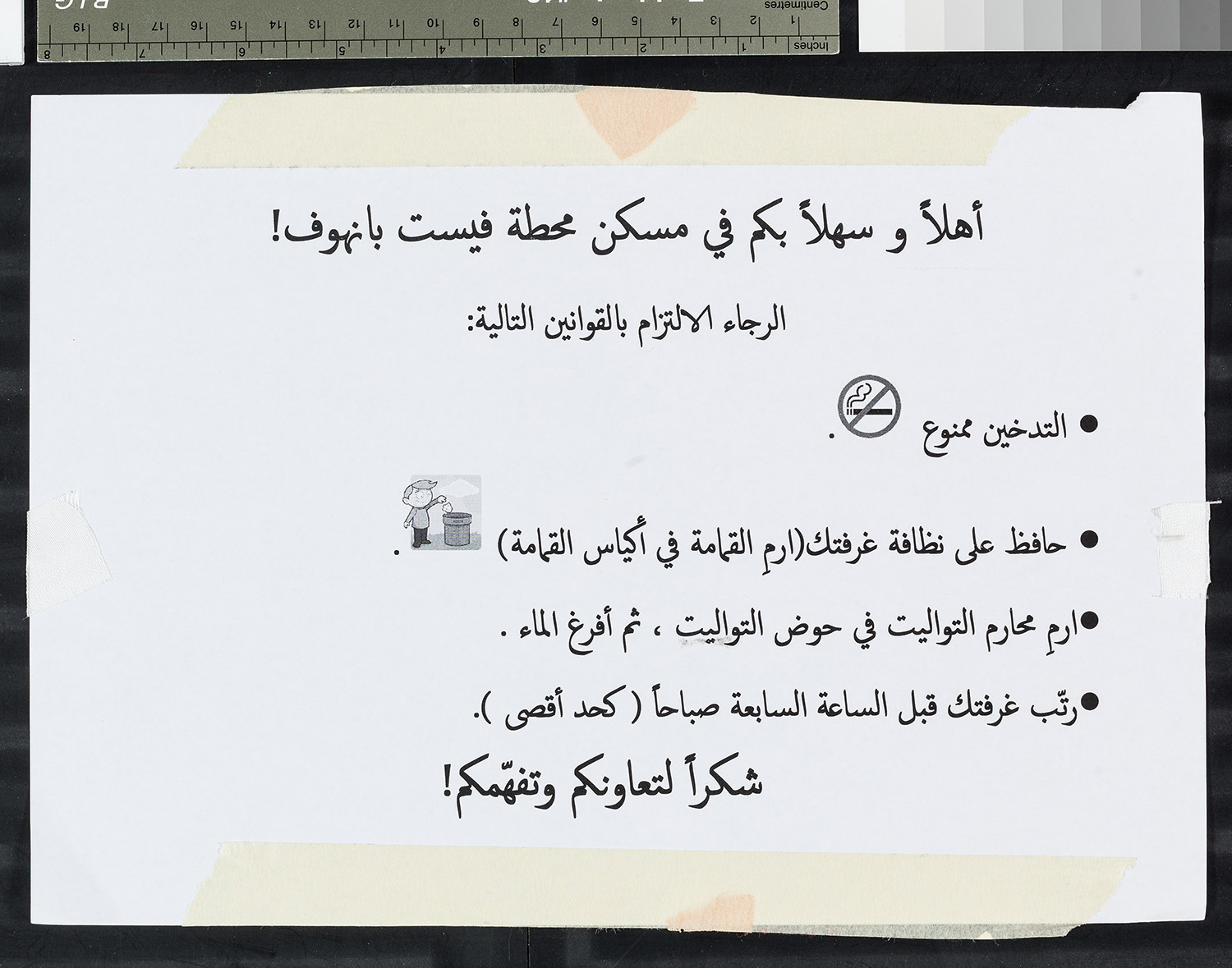 Schilder Hausregeln Notschlafstelle Westbahnhof. In Englisch, Arabisch und Farsi