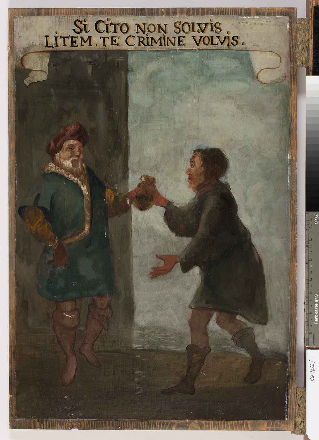 "Fensterläden der Gerichtsstube im Augustinerchorherrenstift Dürnstein: „Si cito non solvis / Litem te crimine volvis.“ Wenn Du nicht bald den Streit mit Geld schlichtest, wirst Du in Anklage versetzt."