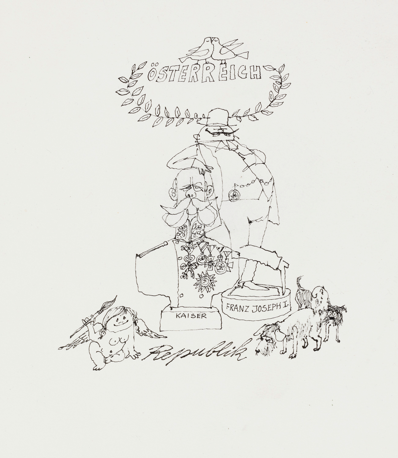 Illustration / Wilfried Zeller-Zellenberg: Seid lieb auch zu Disteln. Vom Undsoweiter der k. u. k. Herrlichkeit 1918 bis dato und in alle Ewigkeit. Gezeichnet und geschrieben von Wilfried Zeller-Zellenberg, Europa Verlag Wien, 1976.