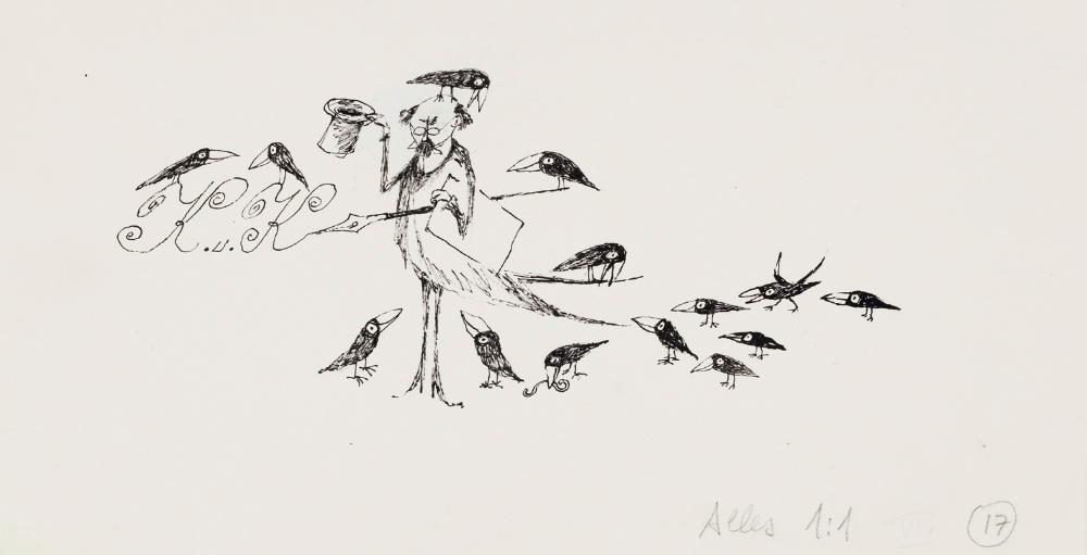 Illustration / Wilfried Zeller-Zellenberg: Seid lieb auch zu Disteln. Vom Undsoweiter der k. u. k. Herrlichkeit 1918 bis dato und in alle Ewigkeit. Gezeichnet und geschrieben von Wilfried Zeller-Zellenberg, Europa Verlag Wien, 1976.