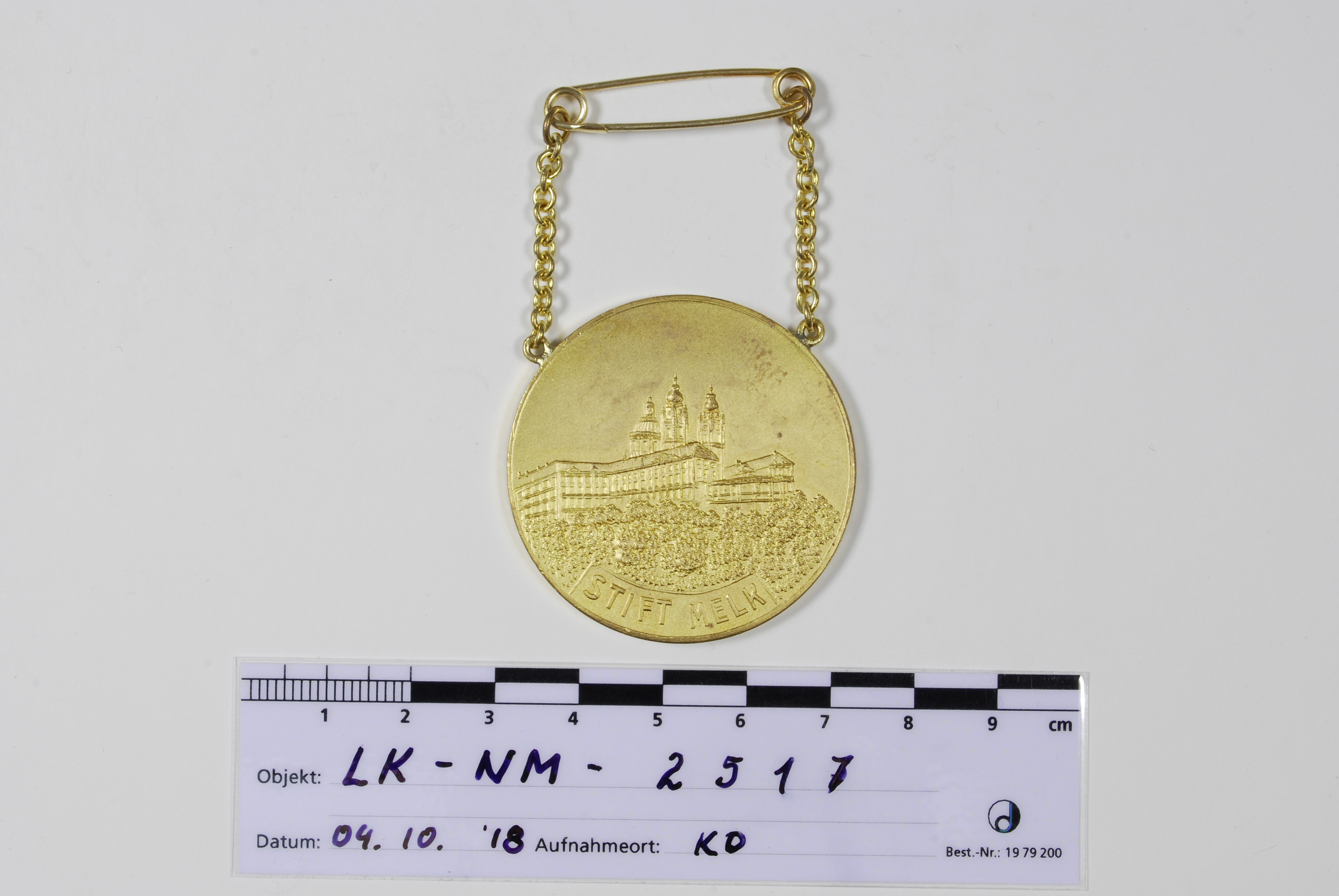 Technische DetailsBronze, geprägt, grainiert, vergoldet, mit angelöteten Ösen, Ketten und Anstecknadel