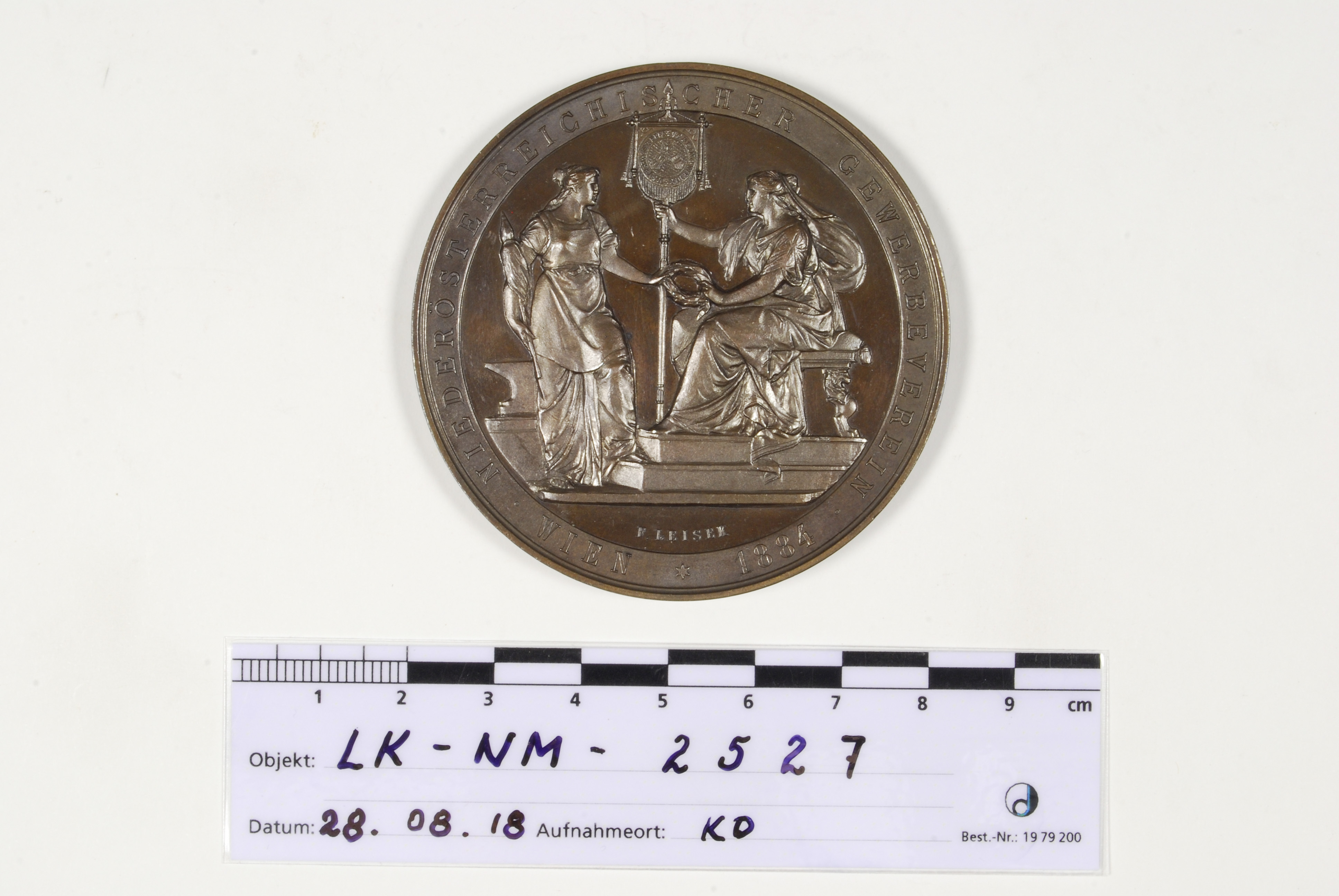 avers: Trohnende Genie (Austria), einer weiblichen Personifikation des Handwerks einen Lorbeerkranz reichend; Genie mit Standarte in der Rechten, darauf Allianzwappen mit Doppeladler, Bindenschild und Wappen von Wien; Personifikation des Handwerks mit Wollspindel in der Rechten, vor Amboß stehend