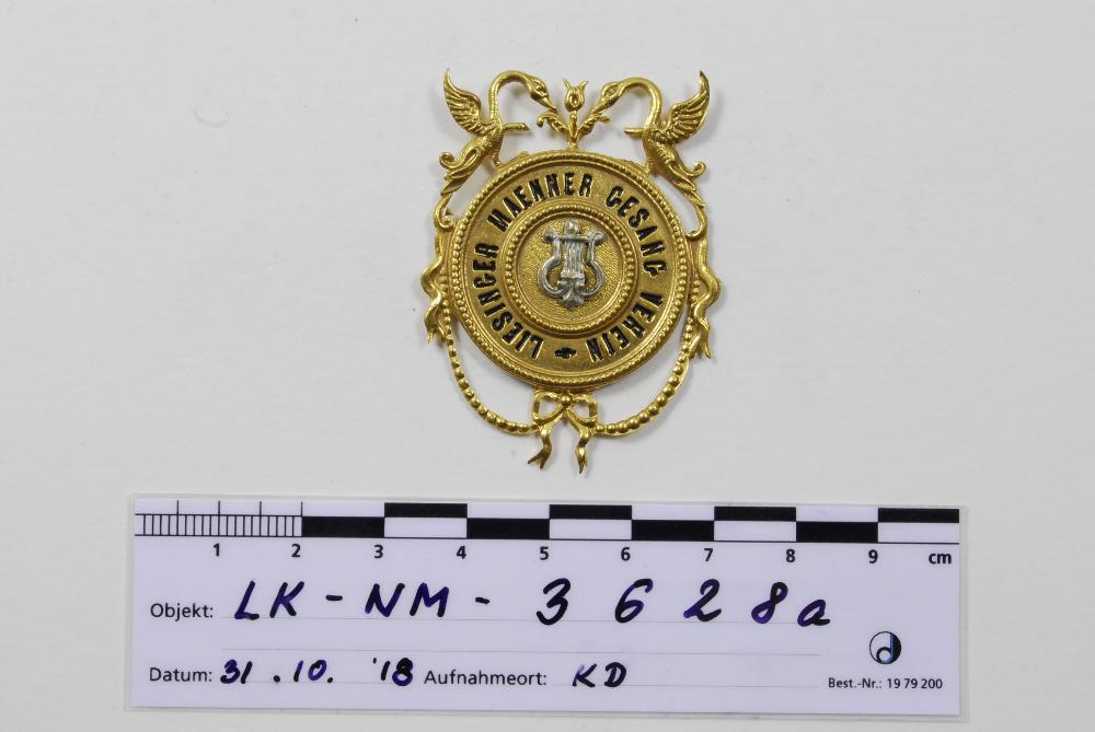 Technische DetailsMessing, geprägt, montiert, versilbert, vergoldet, teils schwarz lackiert, Nadel verlötet (fehlt)