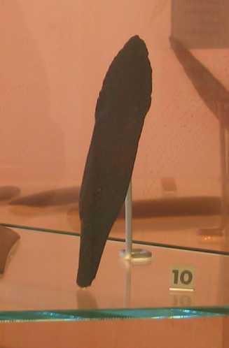 Die dreiteilige Klingenform zeichnet sich durch einen zweigeteilten Schaft mit stumpfen Kanten aus. Das rhombische Blatt ist leicht ausschwingend gestaltet und die Schneiden beidseitig ausgeschmiedet.