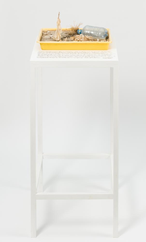 „Brachen / Peripherien / Lücken im Urbanen […]“, beginnt Weinberger seinen handgeschriebenen, bedeutungsschwer aufgeladenen Text auf dem weißen Holztisch der Arbeit Garten. Ein Plastikbehälter ist mit ausgetrockneter Erde befüllt, verdorrte Blätter und Gräser liegen ebenso darauf wie eine weggeworfene leere PET-Flasche. „[…] belassene Orte von denen man weder vom Beginnen noch vom Enden noch vom Stilltand sprechen kann – Gebiete der Möglichkeiten – RUDERAL SOCIETY“.