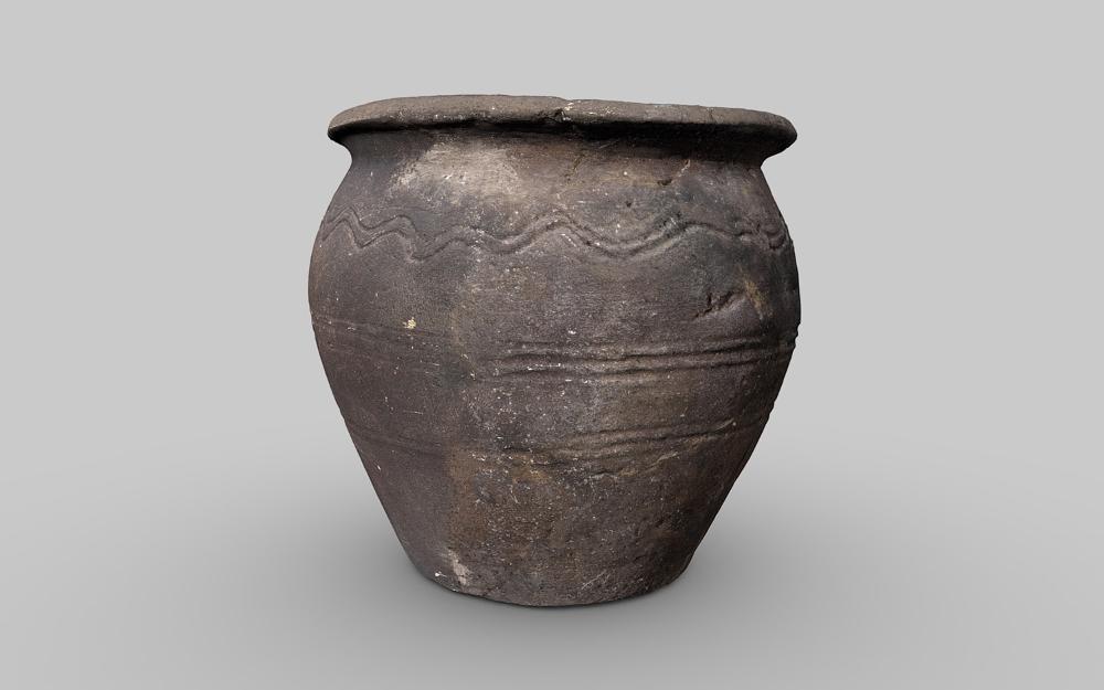 Reduzierend gebrannte Keramik. Slawischer Becher mit Trichterrand, eiförmiger Gefäßwandung, Wellenlinien, horizontalen Rillen an der Außenwand und einfacher Standfläche.