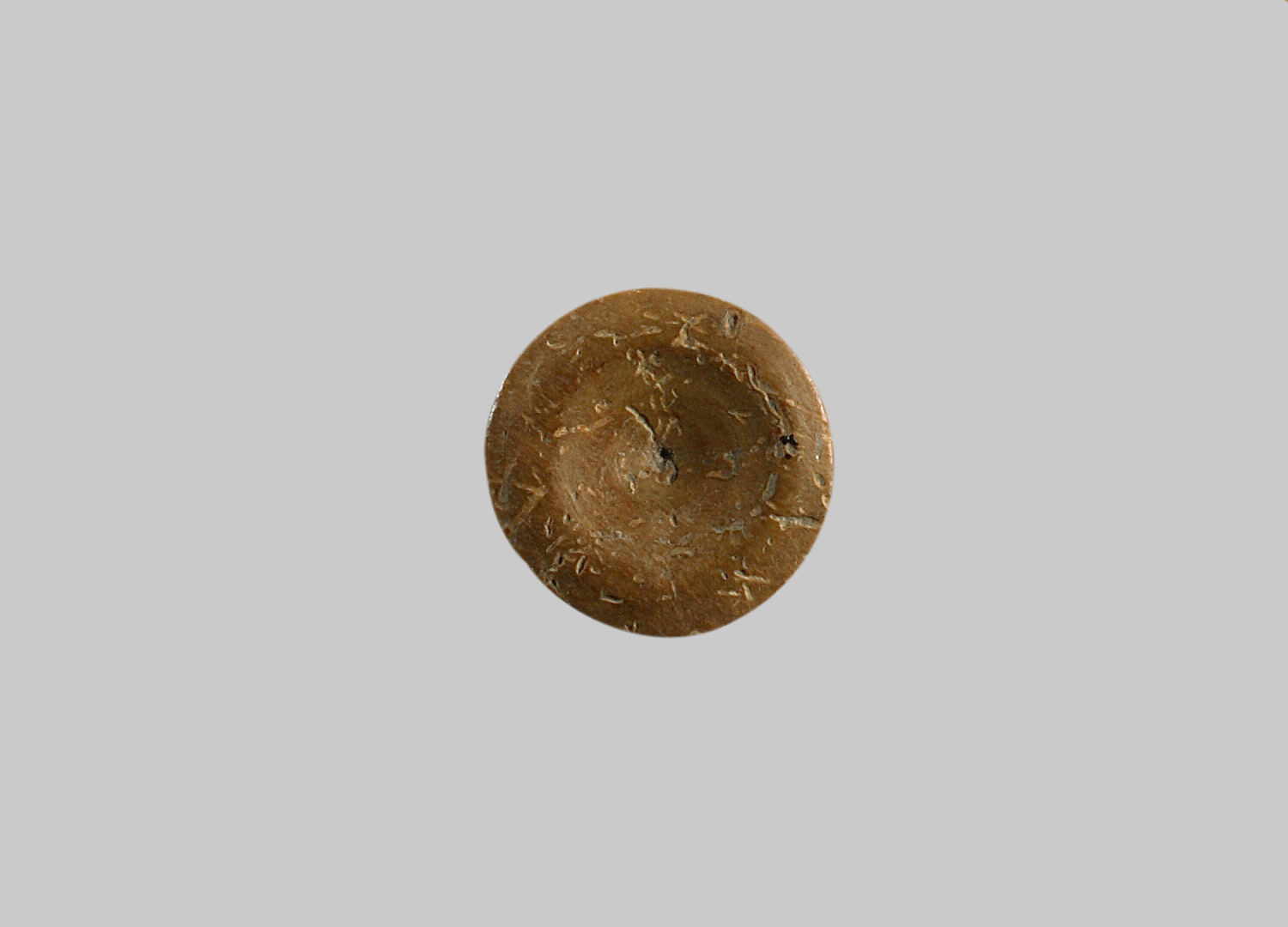 Flacher Spielstein. Oberseite mit zentralem Punkt und muldenförmiger Vertiefung. Glatte Unterseite. Gerade Wand.